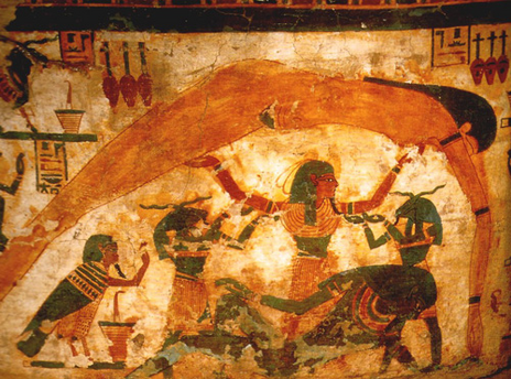 Rá, o deus do sol entrou em sua boca após o pôr-do-sol no anoitecer e renasceu de sua vulva na manhã seguinte. Ela também engoliu e renasceu as estrelas.